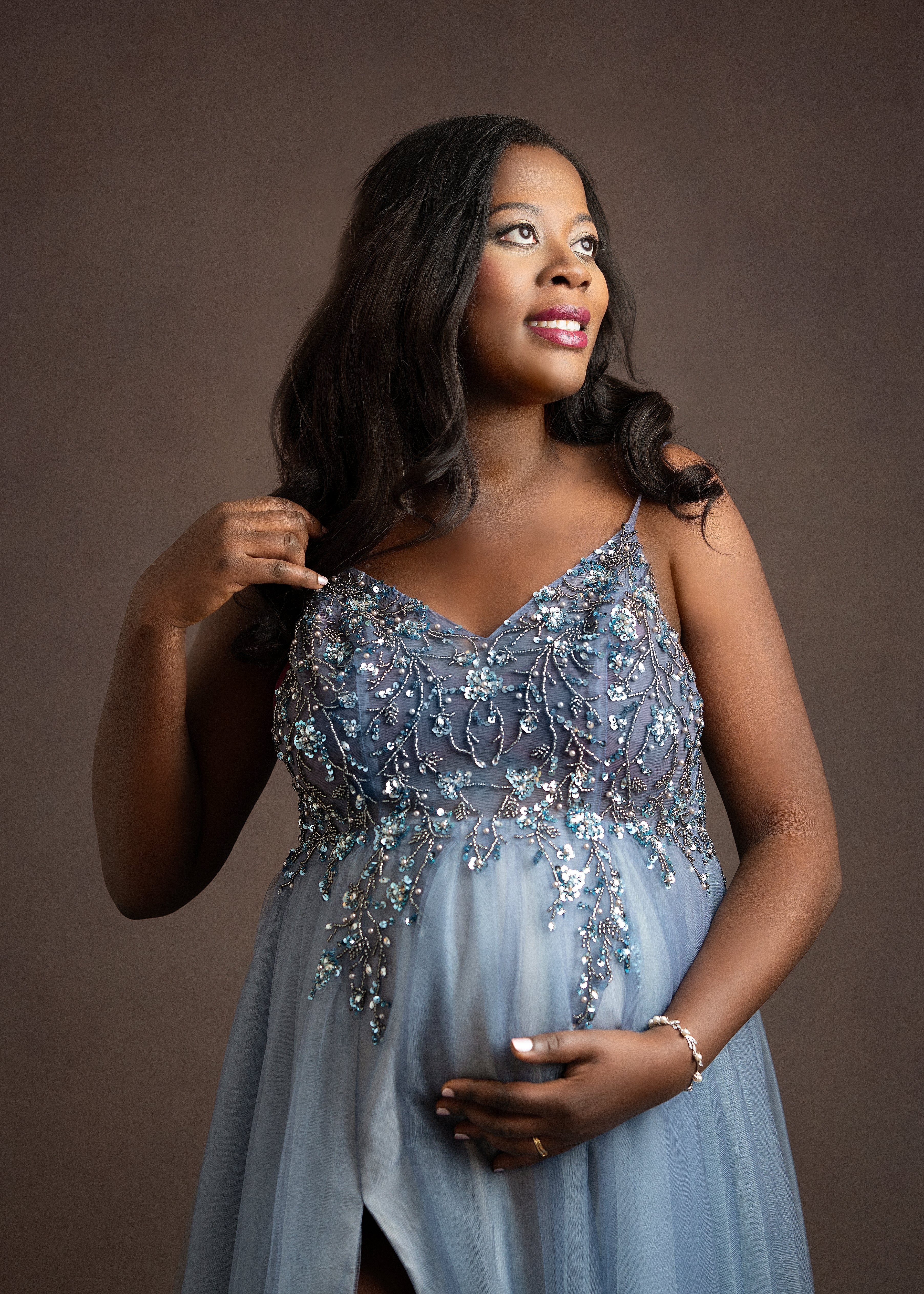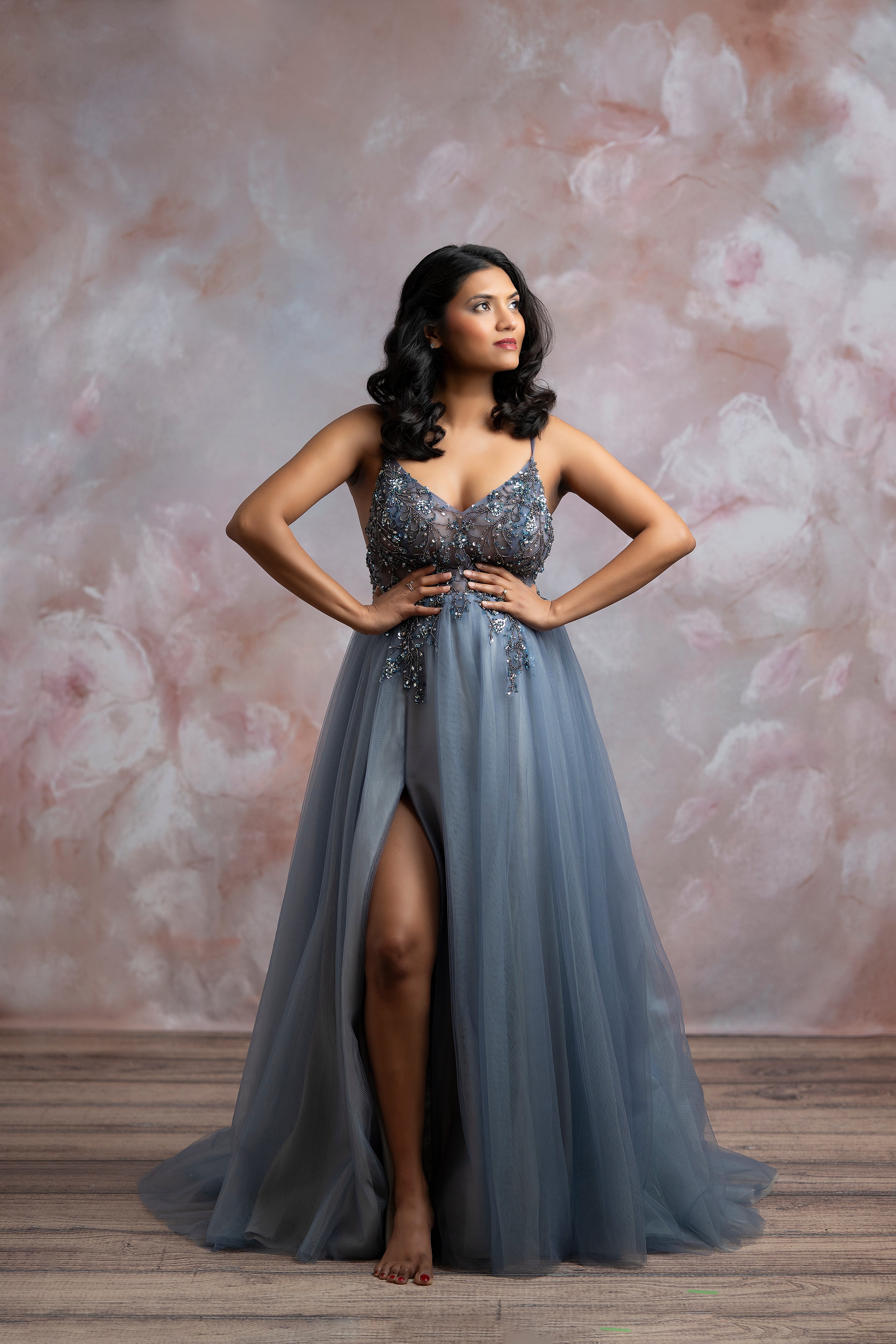 FOR HIRE MATERNITY / PHOTO SHOOT DRESS in denim blue petrol with floral sequin " Roya "